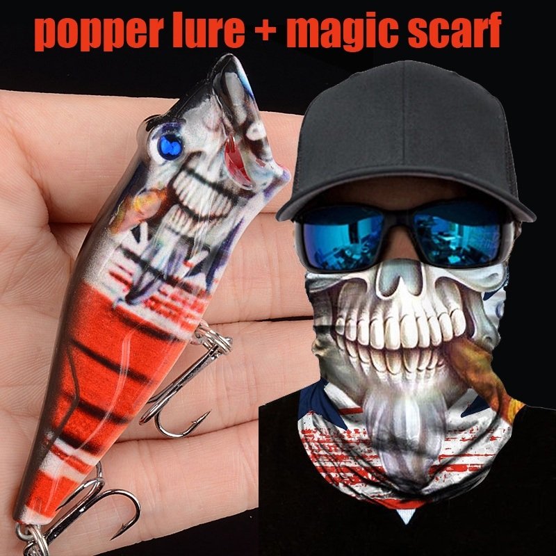 1pc Popper Lure Skull Fishing Lure Artificial Bait + 1pc Mask Magic Scarf Headband Balaclavas